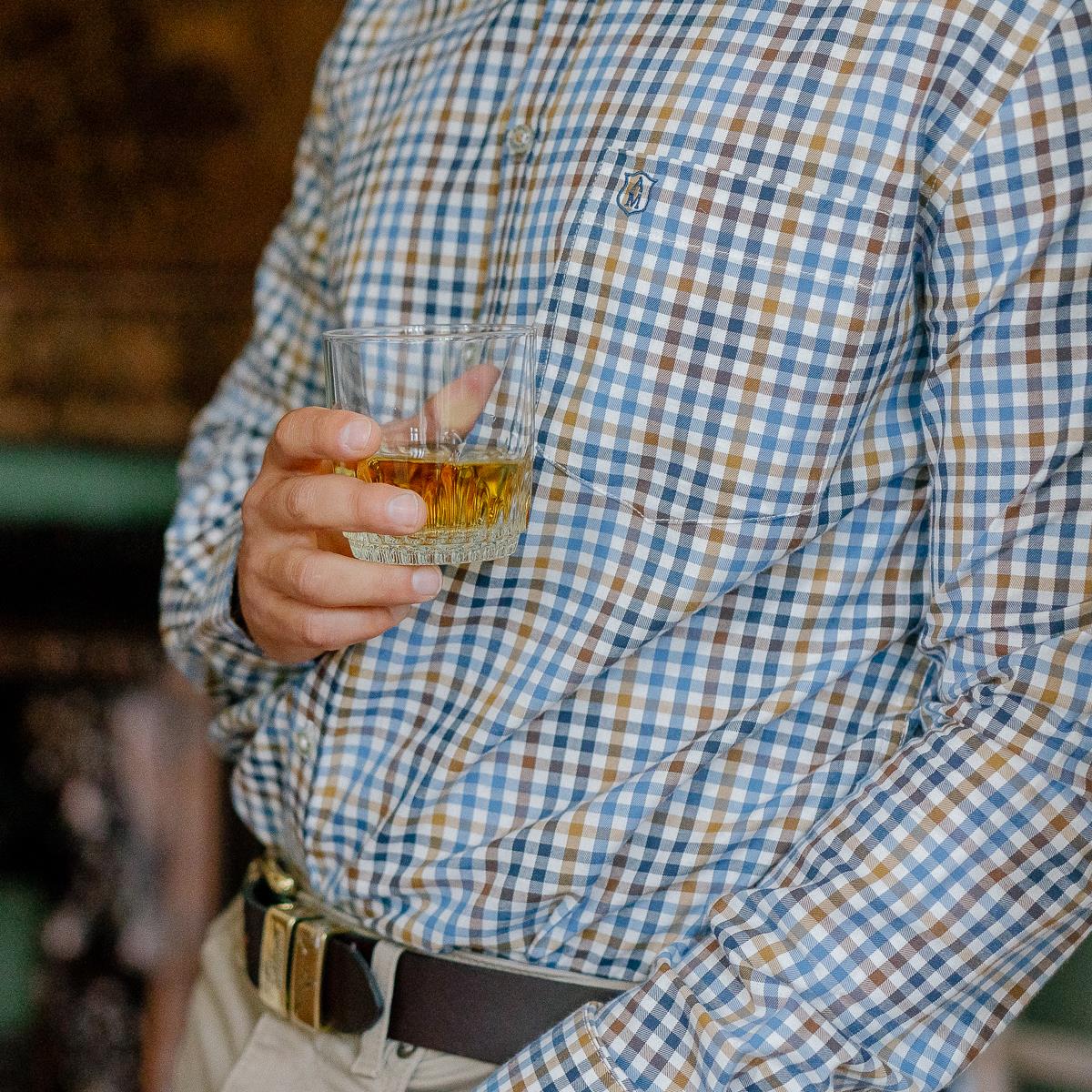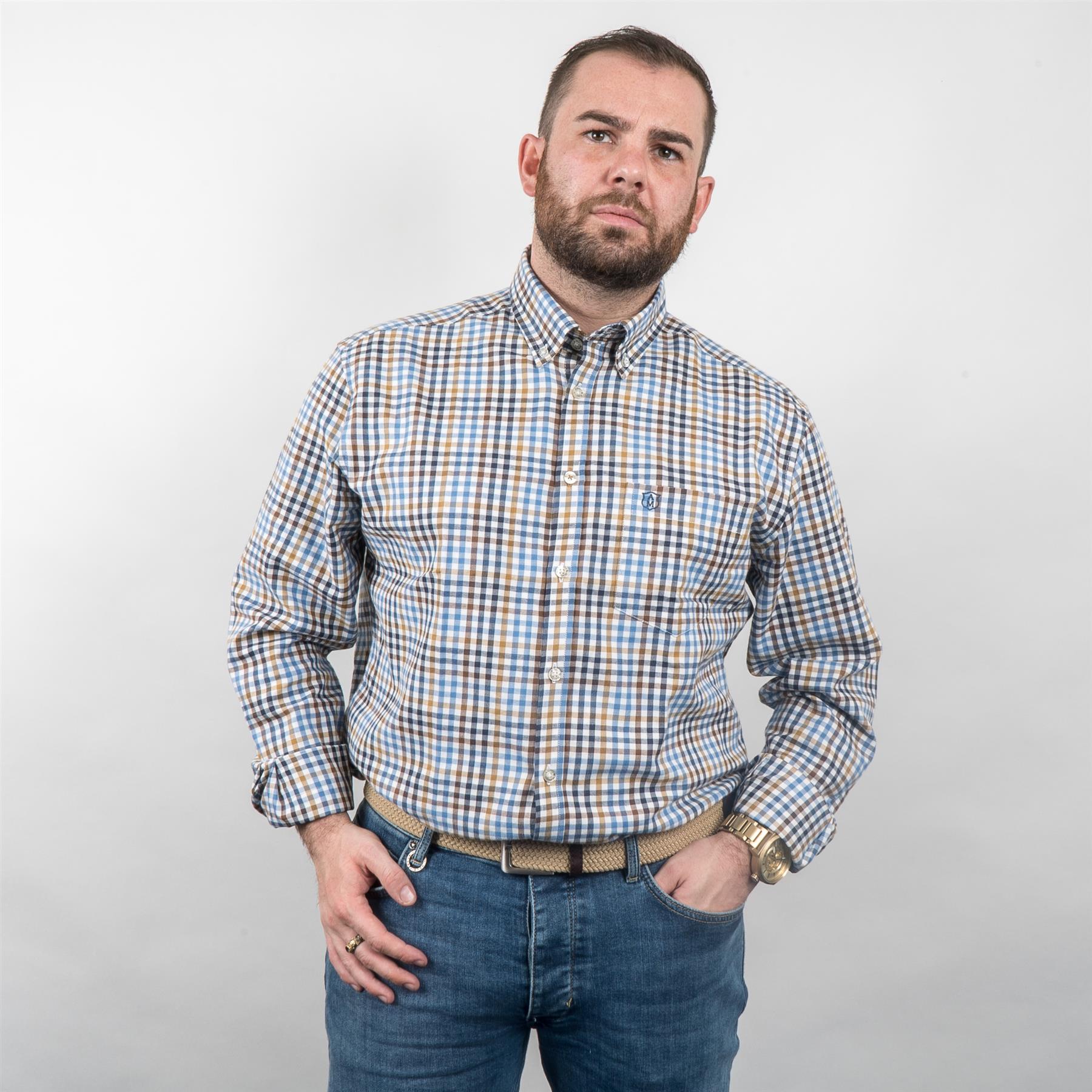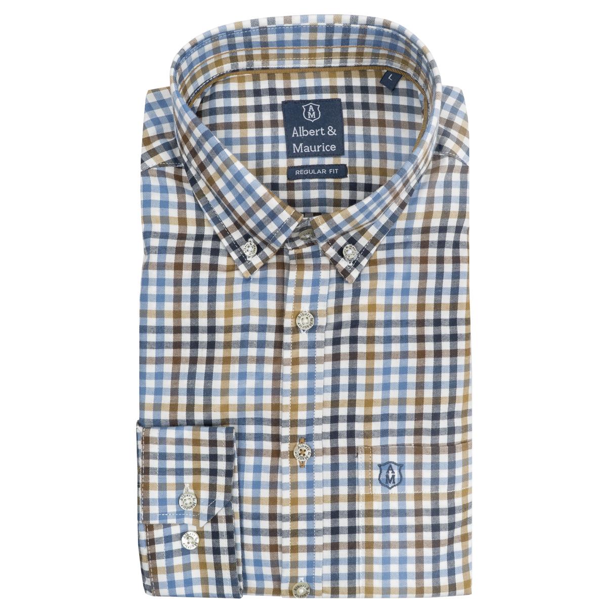 The Withington Shirt by Albert & Maurice is a mens country check shirt with adjustable sleeves and a chest pocket. It has been carefully crafted from 100% cotton, giving a soft and comfortable feel. The Withington Shirt has been designed in a regular fit, allowing for freedom of movement so you can comfortably wear this shirt all day. It has been beautifully detailed with a warming country check pattern, along with branded Albert & Maurice buttons, and finished with an embroidered Albert & Maurice logo on the chest pocket. The Withington Shirt features an attractive blue, yellow, and brown check that resembles the autumn and winter seasons, that will keep you looking dashing all year round whatever the social event might be.